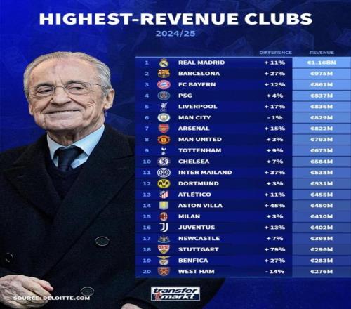 最近德國轉會市場引用德勤的數據,發布了“2024/25賽季收入最高的俱樂部”排名:皇馬以11.6億歐元排第1,巴薩9.75億歐元排第2,拜仁8.61億歐元排第3,巴黎8.37億歐元排第4;緊隨其后的是利物浦第5、曼城第6、阿森納第7、曼聯第8。前幾名把門檻抬得很高,但榜單真正的沖擊點在于——同樣是頂級豪門之間的較量,名次不只拼戰績,更拼俱樂部把“生意”做多大、做多穩。