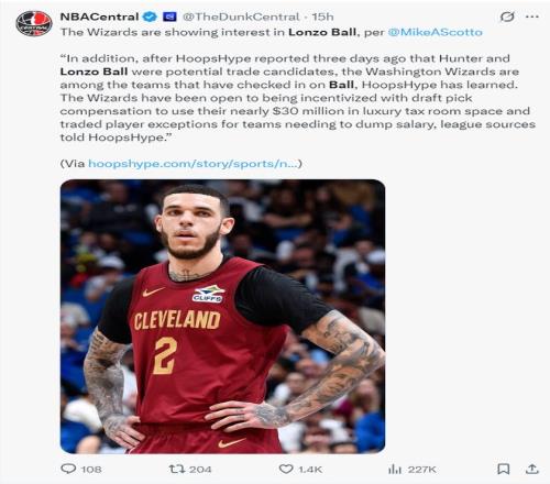 根據NBA記者邁克爾-施密特的報道,魔術隊對朗佐鮑爾感興趣,奇才隊也在考察鮑爾,奇才隊愿意用選秀權補償作為激勵條件,而且奇才隊有3000萬的奢侈稅空間,奇才可以用交易特例來幫助騎士減輕奢侈稅重罰。