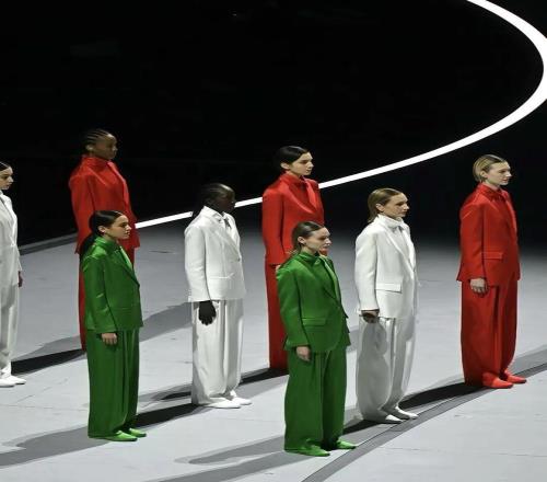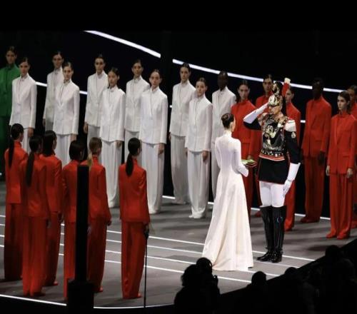 意大利國旗入場之際,全女超模列隊身著紅、白、綠三色西服入場,以色彩勾勒出意大利國旗。以優雅又極具格調的方式,盡情展現著米蘭獨特的時尚浪漫與藝術風采。