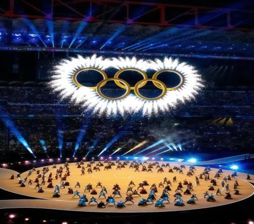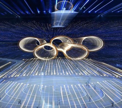 光影流轉,樂聲悠揚,舞者自環中翩然飛出,輕落大地。點點圓環不斷匯聚、相擁,在光影與旋律里緩緩成形,奧林匹克五環燦然綻放,自然與都市、冰雪與文明,于此相擁。