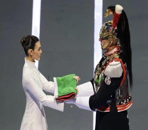 人群盡頭,女護旗手緩步走來,鄭重將國旗交予升旗手。在女歌手深情的吟唱中,意大利國旗緩緩升起,莊嚴而動人。