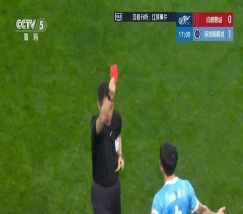 本場比賽的導(dǎo)火索,是開場16分鐘的VAR改判。深圳隊姜至鵬在防守中抬肘,擊中成都外援韋林頓面部,導(dǎo)致后者流血不止,最終縫了15針、牙齒脫位。主裁判原本出示黃牌,經(jīng)VAR提醒后改判直紅,深圳隊被迫10人作戰(zhàn),隨后防線徹底崩盤,最終吞下1-5的慘敗。