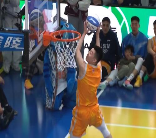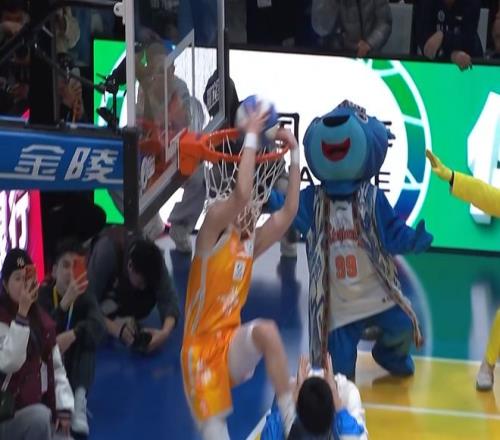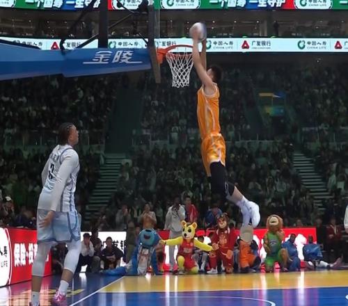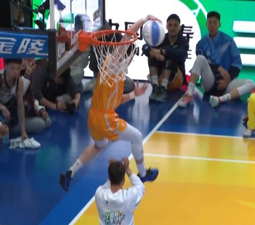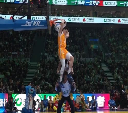 第二個張鼎巖,他叫了兩個人疊在一起,陳登星在上面,球也是陳登星拿著。張鼎巖出發(fā)后彈跳高度非常高,后續(xù)還接了一個背身反扣,輕輕松松獲得50分。