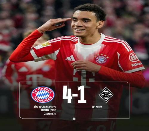 北京時間3月7日凌晨3點30分,德甲領(lǐng)頭羊拜仁慕尼黑坐鎮(zhèn)主場迎戰(zhàn)門興格拉德巴赫。上半場比賽,卡爾進球因越位在先被吹,格雷茨卡妙傳迪亞斯先下一城,迪亞斯橫傳助攻萊默爾破門完成傳射建功。易邊再戰(zhàn),賴茨犯規(guī)吃到“紅點套餐”,門興少一人作戰(zhàn),穆西亞拉點射擴大比分,雅克松搶點破門錦上添花,終結(jié)自己聯(lián)賽進球荒,穆赫亞補射扳回一球。最終,拜仁慕尼黑4比1大勝門興格拉德巴赫,豪取德甲五連勝。