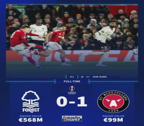 德國轉會市場的數據冰冷而殘酷:諾丁漢森林全隊身價5.68億歐元,隊內擁有多名前英超豪門球星;而他們的對手中日德蘭,全隊身價僅9900萬歐元,甚至不到森林的一個零頭。
